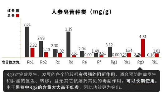 原标题:为什么韩国黑参浓缩液比红参液营养价值更高? 在人参反复的蒸制和晾晒过程中,产生的人参皂苷,在蒸晒九次时含量最高。除了普通的人参皂苷含量高于红参外,黑参中的人参皂苷Rg3含量也是红参的数倍,这种人参皂苷具有极强的抗细胞变异能力。因而黑参的效力也更强! 区别二:人参皂苷含量不同 区别一:蒸制方法不同