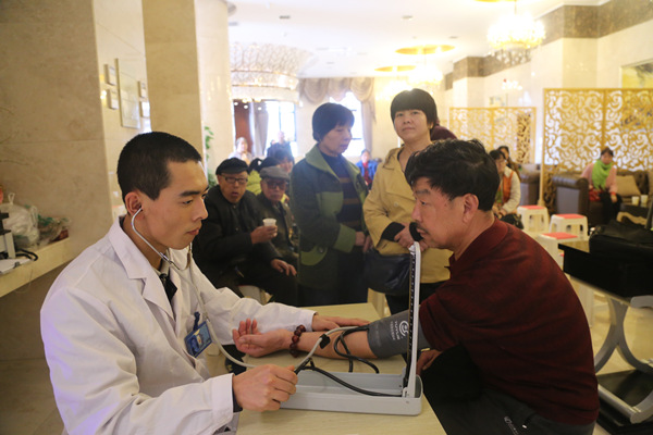 (工作人员为市民测量血压)