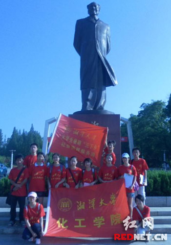 红网湘潭7月5日讯(通讯员 贺伟 刘佳男)今天上午,湘潭大学“魅力化工”暑期调研服务团负责人贺伟同学及其队友略显激动,“全国高校'永远跟党走'主题暑期社会实践活动已经启动,湘潭大学今年所有的社会实践团队都会从这里出发,湘大学子都要朝着毛主席眺望的方向下乡服务!” |
