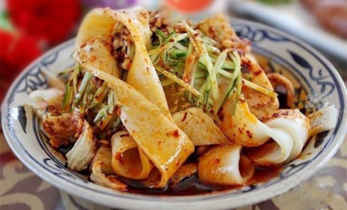 陕西凉皮 一种非常受欢迎的传统小吃。一些地区因方言发音不同而称“酿皮”,以陕西凉皮最为著名。在陕西,凉皮分为米皮和面皮两大类,有西府宝鸡擀面皮(发源于岐山县)、汉中米皮、秦镇米皮等,有麻辣,酸甜,麻辣,香辣等各种口味。凉皮历史悠久,据说源于秦始皇时期,距今已有两千多年历史。