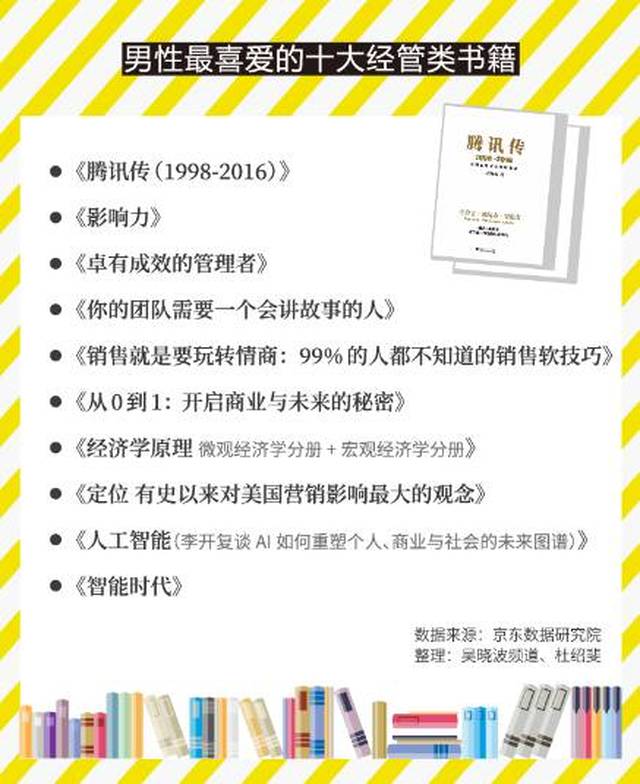 7.新中产男性最爱看的三本书是《腾讯传》《影响力》和《卓有成效的管理者》。 在知识类消费中,男性最倾向的两种方式是通过“购书自修”和“购买在线课程”来提升自我。 的确,大家对购书和看书尤为热衷,小巴也经常收到希望推荐经管类书籍的留言。 这次,我们也通过京东数据研究院的大数据,筛选出了男性最喜爱的十大经管类书籍,其中《腾讯传》《影响力》和《卓有成效的管理者》成为男性购买最多的经管类书籍。