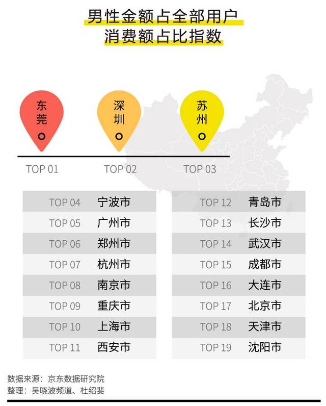 2.东莞、深圳、苏州的男性最能买买买。 大概马上有人发问了,为什么不是北上广?这就要看跟谁比了,论各城市消费总额,北上广的男性确实无人能敌,但比起北上广的女同胞们,男性贡献的消费金额真不算什么。但我们从城市男女消费占比来看,东莞、深圳、苏州的男同胞们就“站”起来了。