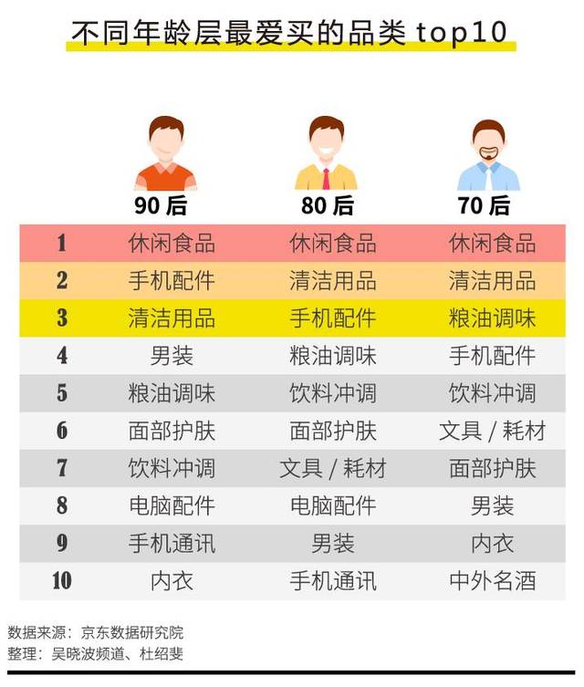 3.90后爱形象,80后爱家庭,70后爱名酒。 从不同年龄层最爱买的品类TOP10来看,80后和90后的喜好颇为相似,在零食、手机配件、清洁用品上买得最多。
