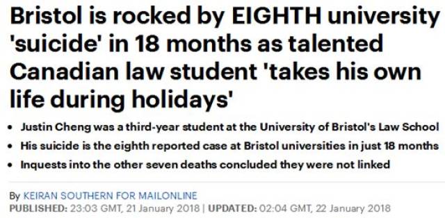英国名校又死人! 在英国布里斯托尔大学(University of Bristol)法学院读书的三年级学生Justin Cheng于1月12日周五晚上被发现已经自杀身亡。