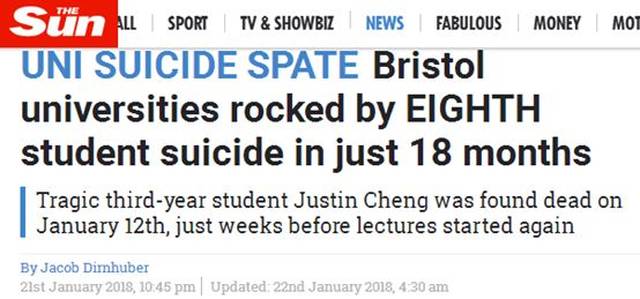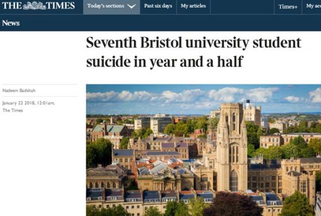 如果学生或工作人员受到这一不幸消息的影响,我们会鼓励他们联系学校相关部门,以及寻求朋友或家人的支持。在我们的网站上,关于在哪里获得帮助的信息可以在员工和学生的网页上找到。 我们将继续与我们的学生、工作人员以及包括来自公共卫生和NHS的同事在内的合作伙伴一起工作,以加强我们的服务,来应对年轻人在心理健康问题上前所未有的增长。” 这一事件受到英国媒体的关注。因为这已经不是该校第一次发生这样的惨剧了,在过去的这16个月内,该校已经有7人自杀身亡。 《泰晤士报》:一年半内布里斯托尔大学第七名学生自杀