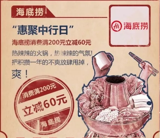 | 华龙网2月26日9时30分讯 嘿,小伙伴们,这个春节,你们过得怎么样呢,春节有没有胡吃海喝,有没有长肉呢。虽然春节已经过去,但不意味着美食季就此结束,小编特意准备了一波美食福利,让我们一起送走春节,吃饱喝足,奋斗2018。 太平洋咖啡:每月16、26日,华夏银行信用卡银联白金卡持卡人(卡号以62开头)在太平洋咖啡全国指定门店购买任意一款挂耳咖啡,可尊享6.2元专享价。每周二、周六,华夏银行信用卡银联持卡人及云闪付持卡人在太平洋咖啡全国指定门店使用购买任意手调饮品,即可享16元特大杯饮品。 活动时间 :即日起—2018年5月27日期间每周日。 Top1:海底捞消费满200元立减60元 活动内容:活动期间,持卡人在海底捞重庆门店,持中国银行银联标识信用卡通过POS机权益认证后,消费满200元及以上立减60元。单卡单日最高立减60元,每卡每日限1次优惠,活动仅限堂食,每桌仅限享一次优惠。 中行信用卡海底捞享折扣