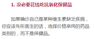 美国国家癌症研究所(NCI)明确指出: “抗氧化剂防止冠状动脉硬化”的流行说法,并不能被证明。 而全世界的保健品卖家,正是利用了大众对研究本质傻傻分不清、对“抗氧化”“抗老化”“抗衰老”这几个词也傻傻分不清的弱点。