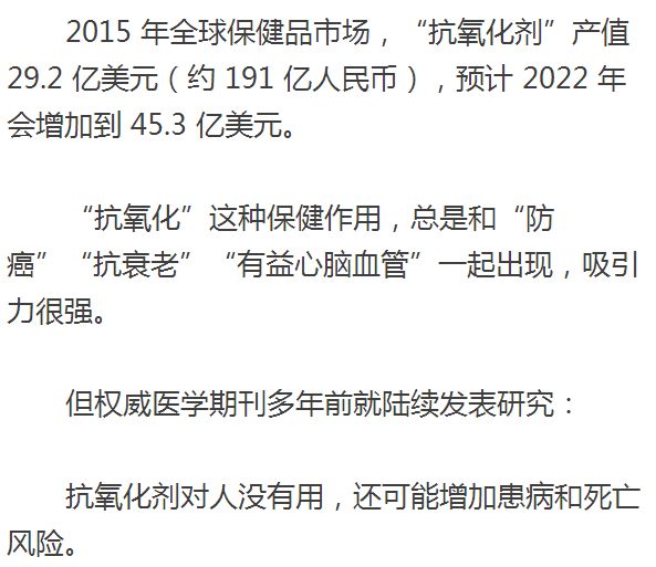 | 抗氧化剂在非人体实验方面获得的研究结果,确实不少。 美国医学会杂志(JAMA)曾通过超 18 万人的高质量研究发现: