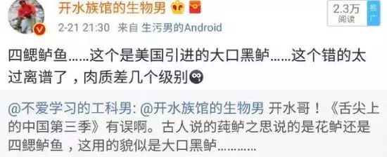 此外,还有网友微博评论:这一集的导演怕不是微商吧 况且,一档美食节目,插了这样一段,这题跑这么远是要闹哪样?怪不得网友不买账! 这种口红简直像三无微商产品啊,一首《凉凉》送给节目组…… 此外,第三集播出之后还引发了诸多关于常识性的吐槽。例如,这两天讨论比较多的鲈鱼话题,节目中错将大口黑鲈当作四鳃鲈鱼。
