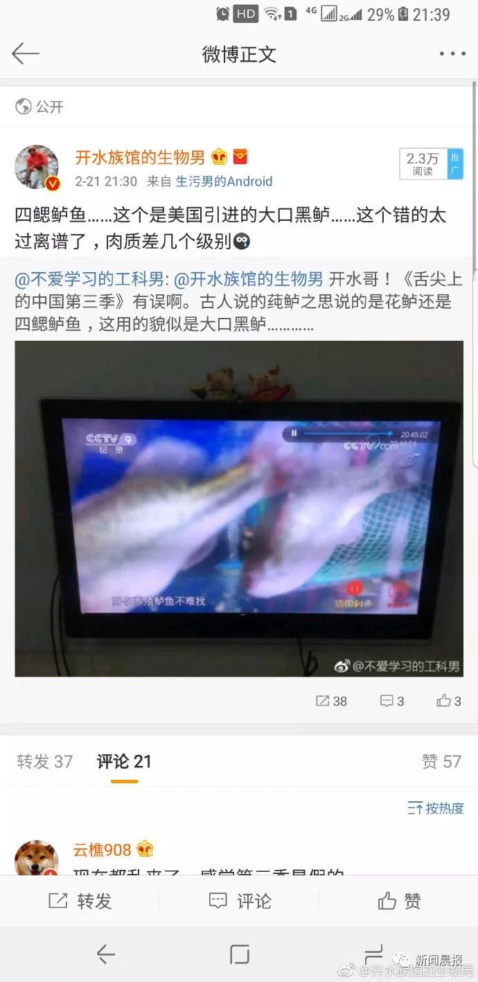 第三集播出之后还引发了诸多关于常识性的吐槽。例如,这两天讨论比较多的鲈鱼话题,节目中错将大口黑鲈当作四鳃鲈鱼。@开水族馆的生物男 是中国渔业协会原生水生物及水域生态专业委员会主任委员,他指出了节目中的错误。