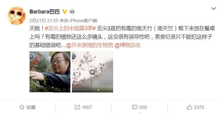 最最关键的是,即便是为了说明中药和药膳的关系,出来一段自制口红到底是为了什么? 诸多细节不严谨同样是在《养》这一集,出现了“草药炖猪脚”这道菜。有网友指出,用草药做菜其实是有一定风险的,毕竟普通人没有分辨草药的能力,很可能会引起误解。 类似不严谨的情况也出现在了其他片段中。 有细心眼尖的网友发现,曾出现在人民日报盘点的《这些有毒植物不能碰》中的南天竹也出现在节目里,虽然节目也说明了南天竹有毒,但还是让它作为装饰品出现在了餐桌上。
