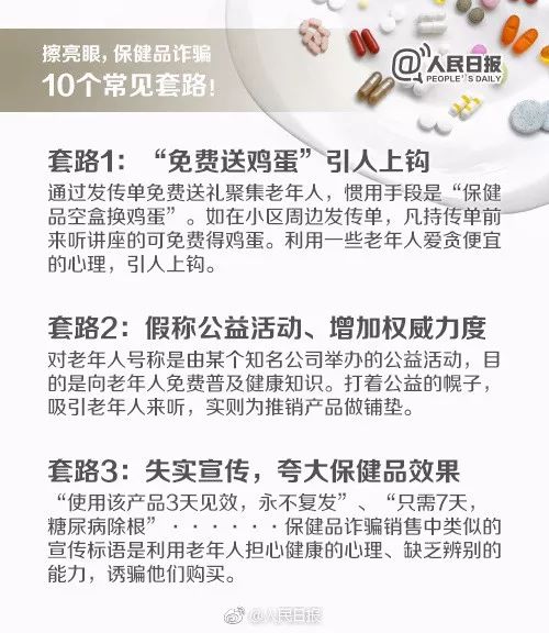 我们都知道“老人免费体验店”经常存在一些虚假宣传欺诈行为。其中“免费送鸡蛋引人上钩”、“假称公益活动,实则推销产品”、“失实宣传,夸大保健品功效”等套路,都让老人防不胜防...... 可立即拨打电话12315进行投诉举报!