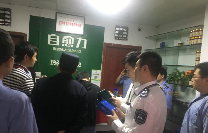 | 3月19日下午,深圳市市场和质量监管委宝安局联合翻身派出所、新安街道海富社区,对宝安区海滨城广场某步行街内的一家保健器材店进行突击检查。 路 击