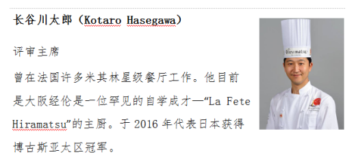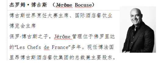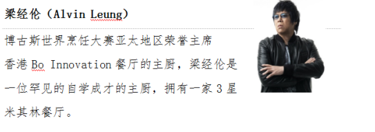 同期活动:世界美食城市联盟2018年春季会议 本届博古斯亚太区选拔赛评审团将由4名评审团主席和12个专家评委组成,给出公正专业的品评结果。4名评审团主席分别是:杰罗姆博古斯(Jérme Bocuse)、梁经伦(Alvin Leung)、长谷川太郎(Kotaro Hasegawa)、斯特凡斯蒂勒(Stefan Stiller)。