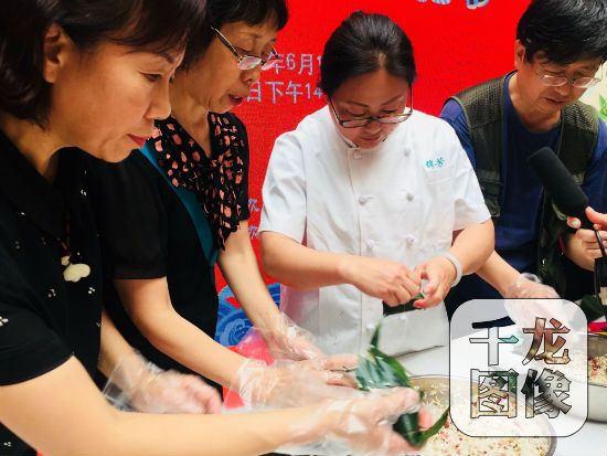 6月8日,第六届北京端午美食文化节在金源新燕莎Mall启动。图为现场举行包粽子比赛,市民跟面点师学包粽子。通讯员 倪丽芳摄 千龙网发 记者在位于金源新燕莎Mall二层大厅的端午美食节现场看到,琳琅满目的小粽子,小龙舟等节日装饰品装点出浓郁的端午节氛围。东来顺、南来顺、紫光园、锦芳小吃、徽商故里、旺顺阁、便宜坊、金鼎轩、西部马华、徽商故里等众多的餐饮老字号、京城品牌连锁餐饮企业纷纷带来了香粽、春茶等特色时令美食,更是令人目不睱接。