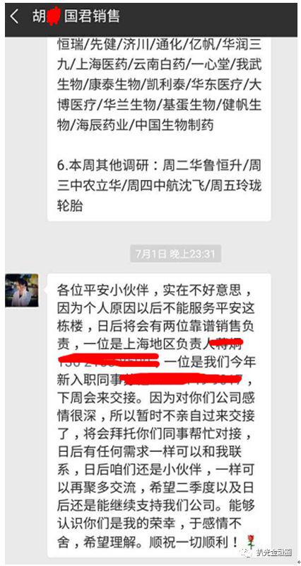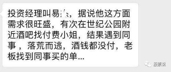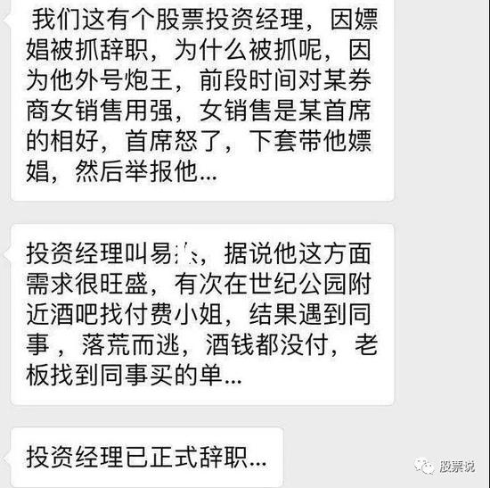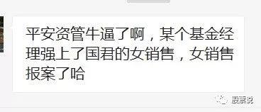 来源: 股票说 股市连续阴跌,金融从业人员上火! 刚刚,魔都金融圈发生了狗血桃色八卦! 平安资管基金经理(YJ),潜规则不成强上国泰君安女销售(HH),谁曾想女销售是人家券商新财富首席(BYX)的相好,为了报仇,B首席就带Y经理嫖娼,然后110,Y经理被抓。