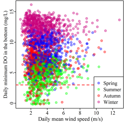在国家自然科学基金等资助下,中国科学院南京地理与湖泊研究所湖泊生态系统动力学研究团队秦伯强课题组以我国第三大淡水湖太湖为例,通过高频原位观测、长期定点观测以及室内实验等手段,研究了风速下降对太湖水体富营养状况的影响。气象观测资料显示:太湖地区近年来全年风速均呈现显著下降趋势(图1),主要表现为中高风速(>3 m/s)出现频次显著下降。同时,每月日平均风速<3 m/s的最大持续天数显著上升。由于太湖污染严重的北部湖区底泥受风浪扰动的临界风速约为3-4m/s,因此太湖地区中高风速的下降将有利于增加太湖水柱的稳定性。 太湖属于大型浅水湖泊,通常认为水柱常年处于混合状态。但根据高频观测资料显示,太湖水柱在低风速期可能出现短暂的分层现象并引起湖泊底部缺氧甚至厌氧,尤其是在生产力旺盛的夏秋季节(图4)。随着风速下降,太湖梅梁湾底部夏季溶解氧日最低值2007-2016年间呈现显著下降趋势(图5)。 图4 太湖梅梁湾底部溶解氧浓度日最低值与风速的关系 图2 太湖1997-2017年间营养盐浓度与风速的关系 |
