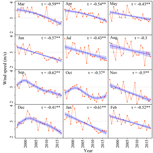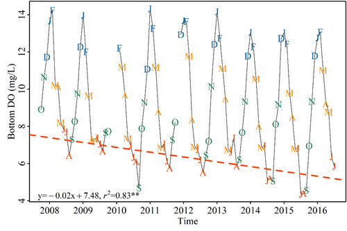 | 图1 太湖1997-2017年逐月平均风速变化趋势 传统观点认为,在浅水湖泊中风浪扰动能显著增加水柱中营养盐的含量,营养盐释放量在一定范围内与风速呈正相关。同时也有研究表明,风浪扰动引起悬浮的营养盐形态主要以颗粒态为主,而能被藻类直接利用的溶解态含量变化不大,并且水柱中营养盐含量随着风速减弱、颗粒物沉降而逐渐降低。该研究认为随着风速下降,尤其是低风速持续时间延长,湖底间歇性缺氧/厌氧的概率增加,更有利于浅水湖泊中底泥溶解性营养盐的释放,从而加重水体富营养化。上述研究成果发表在Science of the total environment上(Climatically-modulated decline in wind speed may strongly affect eutrophication in shallow lakes, 2018,645:1361-1370)。 太湖历史观测资料显示水柱中溶解性营养盐浓度及其与总营养盐浓度的比值均与年平均风速、每月日平均风速持续< 3m/s的最大天数显著相关(图2)。结构方程模型表明太湖地区风速变化能显著影响水柱中营养盐浓度(尤其是溶解性营养盐浓度),并进一步影响水柱中藻类生物量;而其它因素如降雨、气温等对水体中营养盐及叶绿素浓度的影响较弱(图3)。 图5 2007-2016年间太湖梅梁湾底部溶解氧逐月变化趋势