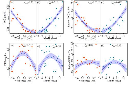 气候变化是影响湖泊生态系统的一个重要因素。当前关于气候变化对湖泊生态系统影响的研究大都仅重点关注温度或者降水的改变,往往忽略了其他因素,例如风速的变化。多源气象资料显示近年来全球近地面风速显著下降是当前气候变化的一个重要特征。浅水湖泊,尤其是大型浅水湖泊,极易受风浪扰动影响造成水柱混合、引起底泥悬浮、改变水-泥界面等溶解氧含量,进一步影响浅水湖泊中多种理化过程。但目前还不清楚大型浅水湖泊生态系统如何响应风速的长期变化。 论文链接 图3 风速、降雨、气温及营养盐浓度等与太湖水体中叶绿素的关系