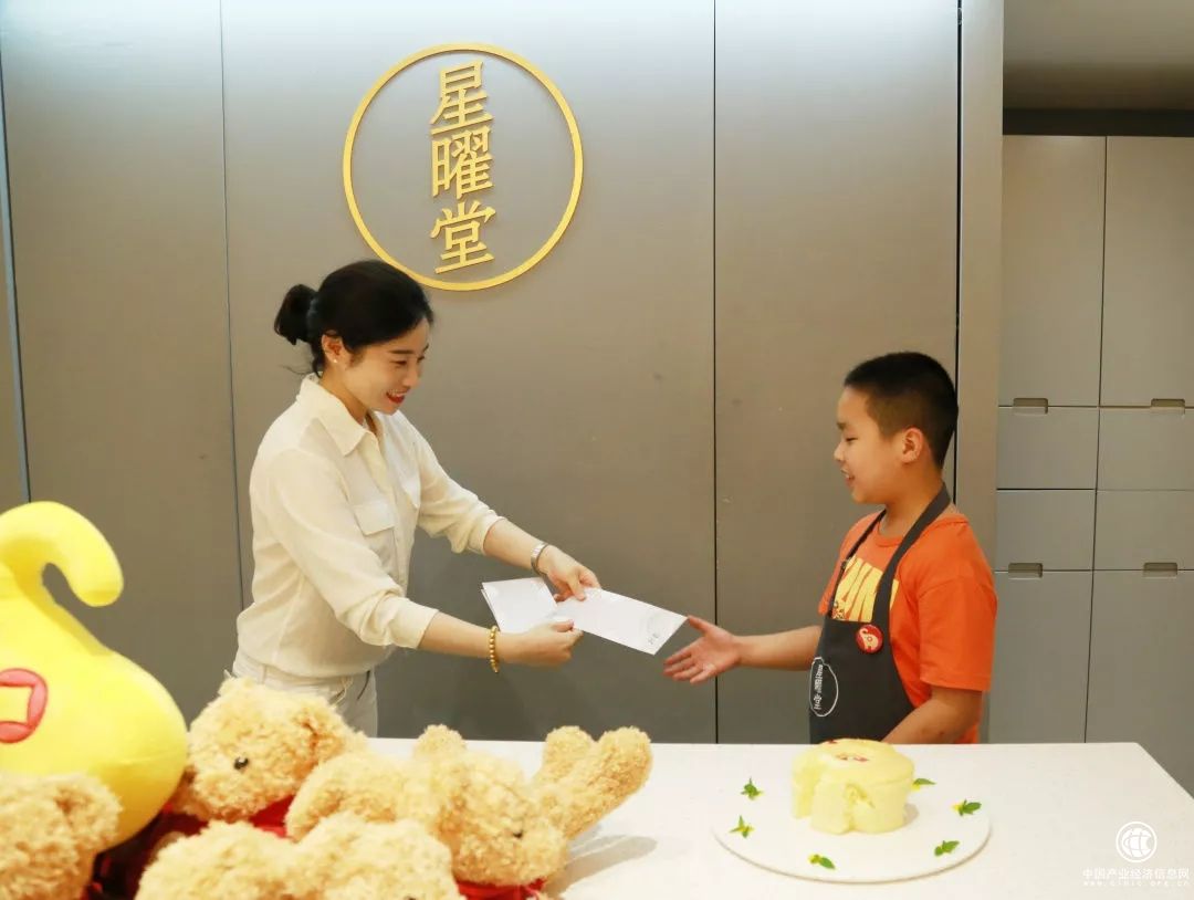 捞财宝CEO朱钰给获得最佳蛋糕造型奖的小朋友颁奖,奖品为星曜堂西点体验券金券。