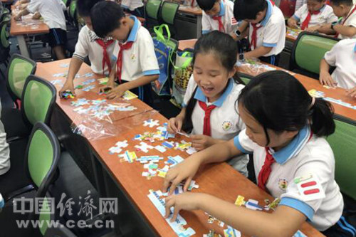 趣味拼图游戏让同学们乐在其中 经济日报-中国经济网记者 吴晓薇/摄 随后,监管人员还开展了食品安全趣味拼图等科普宣传活动。助教老师为同学们分发了两种图案的“食安科普拼图”,学生们两两一组,不一会儿便将图案拼凑整齐了。这时同学们发现,这些图画上印有一些均衡饮食的小知识。经过助教老师的引导,同学们学习到,蔬菜中含有矿物质、维生素等水果中代替的物质。在日常饮食中,需要保证食物的多样性,这样才能吃出健康。