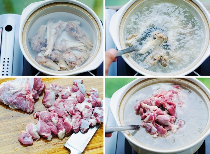 6、煮到汤汁发白,羊肉熟透。 4、把羊肉倒进羊棒骨汤里。