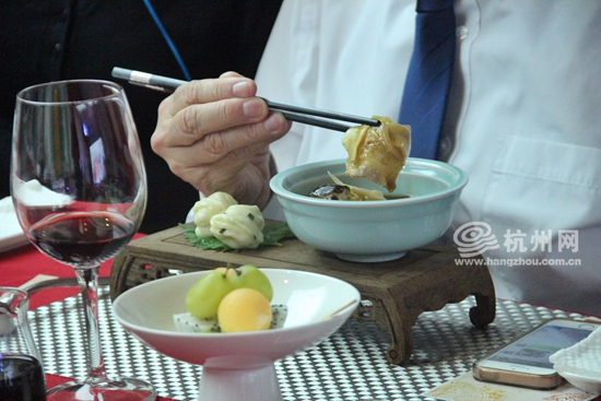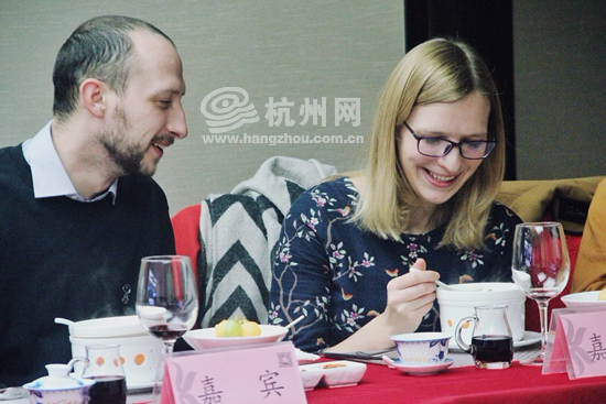 现场每道菜肴上菜前都会通过一段介绍视频来告诉大家菜肴的制作方法,来自美国芝加哥的妮可女士也对杭州美食赞不绝口,“太棒了,我终于知道这些菜肴的制作方法了,我一直很好奇,边欣赏越剧边品尝美食这个体验也很棒。” 为向国际友人展现中华传统饮食文化,更好地宣传推广杭帮菜,11月30日,最忆杭州味——中外媒体国际友人美食节万事利集团万事利丝绸文化餐厅开幕。活动由杭州市商务委员会、杭州日报报业集团主办,杭州网承办,杭州市餐饮旅店行业协会、万事利集团等单位协办。 来自世界各大媒体记者、国际友人齐聚一堂品尝地道的杭州美食。现场品尝完现场美食的外国友人纷纷表示被杭州美食征服了,“菜肴非常精致,无论口味还是色彩搭配,都让人很满意”来自杭州国际学校的黑特曼先生表示。