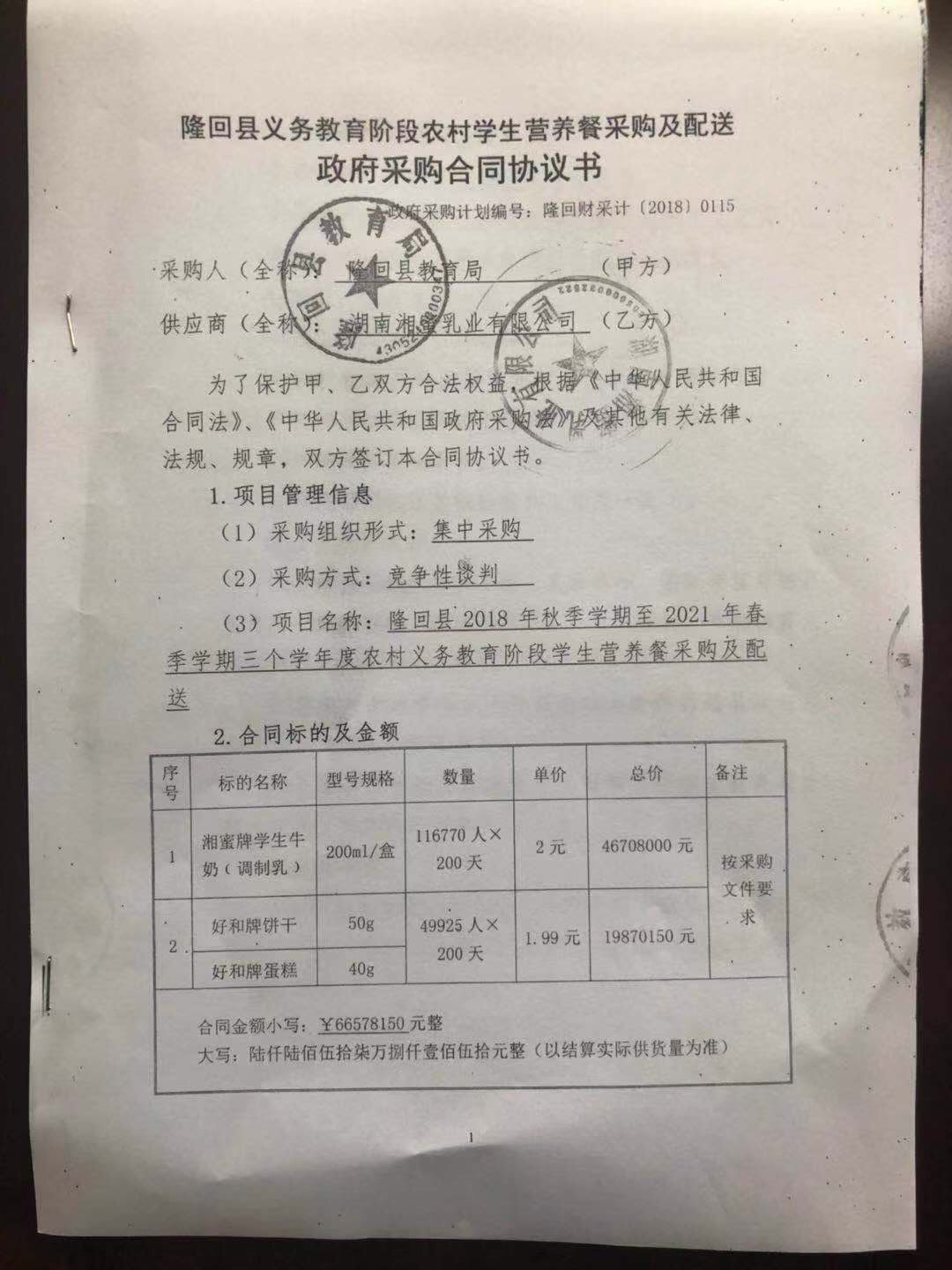 新京报记者注意到,在涉事企业提供的调制乳营养成分表一栏,该种类牛奶的蛋白质含量为2.4g/100ml,脂肪含量为2.6g/100ml。而根据中国奶业协会团体标准-学生饮用奶系列标准,要求蛋白质含量≥2.4g/100ml,脂肪含量≥2.9g/100ml。显然,湘蜜企业供奶脂肪含量标准低于中国奶业协会团级标准。 供奶公司称其通过审查中标 采购总价超四千万
