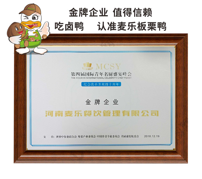 在改革开放四十周年之际,麦乐板栗鸭在第四届国际青年名厨盛宴峰会上斩获“金牌企业”奖项。世界级美食大咖,多位国家级评委、优秀企业家、著名烹饪大师、米其林大厨、老中青三代烹饪大师、行业领导以及美食先锋等700多人齐聚在郑州五洲国际酒店,出席本届峰会。 厨房烽火仍在继续,中国餐饮界再次激荡起传承与回响的赞歌,麦乐板栗鸭作为板栗鸭品类的开创者,以其国际化的选材标准、科技化的品牌运营、民族化的口感体验,成为“中国卤味”的新名片。麦乐板栗鸭创始人马海龙先生曾说道:“我们精选优质食材,做良心产品,坚持把最优质的产品送给每位顾客,安全和健康将会是所有麦乐人一直坚持的准则和底线”。
