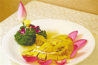 莲香白切鸡 香花入馔,可做菜可煲汤可调味可添色,实乃色香味俱全。所谓食在广州,绝非浪得虚名。 鲜花入馔:太史蛇羹“偏爱”大白菊 在不少广州经典菜式中,花已然成为“标配”。记者从多位粤菜厨师口中了解到,花在一道菜肴中,主要起三个作用:一是调味,二是养生,三是增添诗情雅意与菜肴颜值。 鼎鼎有名的太史蛇羹是20世纪20年代广州食坛首席美食家江孔殷江太史创出,菊花就是蛇羹佐料中的“主角”。据江太史的孙女江献珠女士回忆,当年他们家中雇用4个花王,其中两位专职种菊。自家栽种的大白菊除了观赏,还有一个重要使命,便是用于蛇羹;此法做出的蛇羹味道鲜美而无土腥气,更取菊花之雅。今日顺德仍有酒家效仿江太史,同样自栽白菊专供这款蛇羹。
