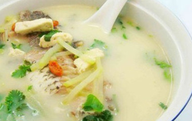 一、鲫鱼汤 材料:鲜活鲫鱼150克,葱姜适量,鲜薄荷适量。 做法:把鲫鱼去肚杂洗净,加适量猪油、盐调味,水煮熟,再加葱白一根,生姜一片,鲜薄荷20克,水沸即可。汤、肉一起吃,鲫鱼有健脾利润止咳的功效。
