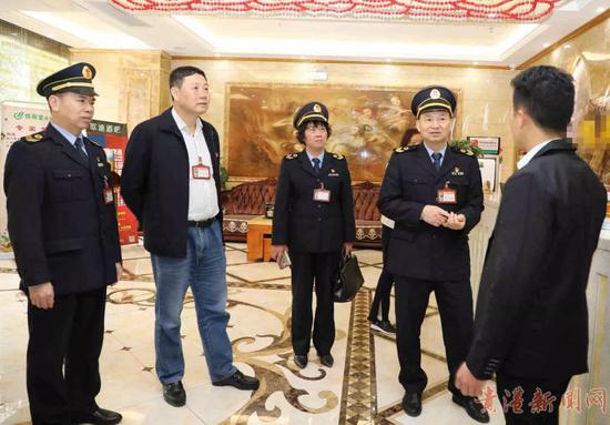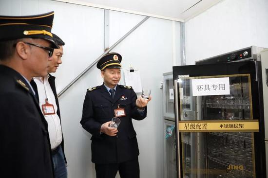 随后,执法人员随机打开一间双人标间客房。“你们的床品用具多久更换?” 张振深问。“我们一直按照要求严格做到一客一换的。”酒店负责人说。执法人员掀开被子、床单、床垫,层层检查。客房的洗漱杯、茶杯是非一次性的,张振深举起其中一个玻璃杯在灯光下照看,“有点水渍,应该是没有擦干水分就消毒了。” 张振深说。 9时17分,执法人员来到消毒间。消毒间三个柜式消毒柜靠墙放,执法人员上前检查有没有通电,并抽检杯子。“个别杯子有水渍印子,消毒前一定要擦干水。”张振深说。“我们会认真整改。”酒店负责人表示。 “消毒完的杯子放去哪?平时怎么转运到客房的?”港北区卫生计生监督所副所长倪佩嫦问。酒店负责人介绍了他们的中转消毒柜和转运箱,倪佩嫦现场指出几处不规范的地方:“中转消毒柜要跟其他消毒柜放一边,且要通电运行;转运箱要标识已消毒和未消毒,规范干净杯子和脏杯子的转运管理。” 检查中,执法人员除了现场检查,还认真查看相关台账材料,检查卫生许可证、从业人员是否持有健康证、公共用品清洗消毒保存更换是否规范登记等情况。
