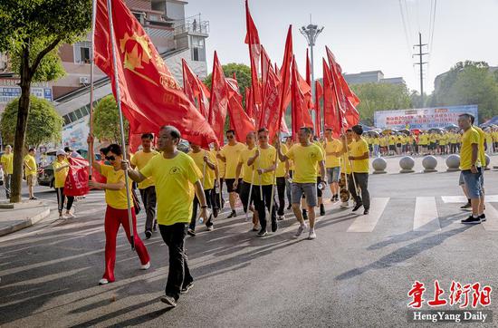 当天,共有460人参赛。竞赛分为徒步竞赛、徒步体验、自行车骑行三个组。一行人从先农花园群英广场出发,徒步竞赛路线为沿人民路至两路口九福祥超市、麇城路至黄金园、衡山大道到沿江路、沿江路至县水利局、沿人民路返回至群英广场,途经4个签到点。全程约7.5公里,跑步约45分钟;徒步体验路线为沿人民路至县粮食局、沿龙泉中路至衡山大道、沿衡山大道至城关派出所、沿群英街返回至群英广场,全程约2.8公里,步行30分钟左右。骑行线路是沿人民路至两路口九福祥超市、沿麇城路至黄金园、沿107国道至金龙中学、经青山村至何家大园、经衡山专用汽车制造有限公司至五一北路、沿五一北路至巴黎春天、沿人民路返回至群英广场,全程约15公里,骑行40分钟左右。一路上均有公安交警护卫,旗手和群众助威加油。