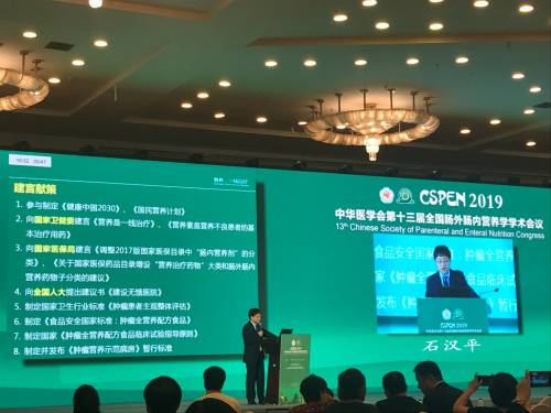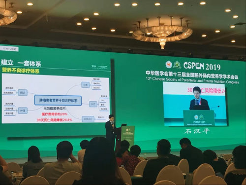 中华医学会肠外肠内营养学分会主任委员、中国抗癌协会肿瘤营养专业委员会主任委员石汉平教授。在本次大会上针对肿瘤营养治疗发表了建立 “肿瘤患者营养不良诊疗体系”的观点,体系包括诊断:营养筛查、营养评估、综合评价;治疗:营养教育、ONS、管饲、肠外营养;疗效评价:整体评价;随访:随访系统、终末期预测;护理:院内护理;延续护理;居家护理。该体系在示范病房内实施,医疗费用节约了20%,30天死亡风险降低了24.6%。随后石教授分享了临床营养治疗的进展和推动情况。其中特别提到了肿瘤全营养配方食品的国家标准制定。