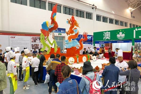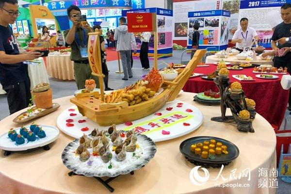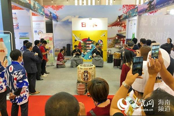 2019年(第五届)海南国际旅游美食博览会上各式美味佳肴琳琅满目 人民网记者枉源 摄 在国际展区和一带一路展区,有来自日本、印尼、意大利、俄罗斯、格鲁吉亚、澳大利亚、印度、菲律宾、越南、马来西亚、法国、韩国、泰国、斯里兰卡、柬埔寨、乌兹别克斯坦、加纳等17个国家和地区的知名美食企业参展。其中,日本食品企业首次以团队的形式(日本馆)参与海南的展会,现场还准备了日本传统特色的镜开仪式“酒桶砸木盖吃酒”等。