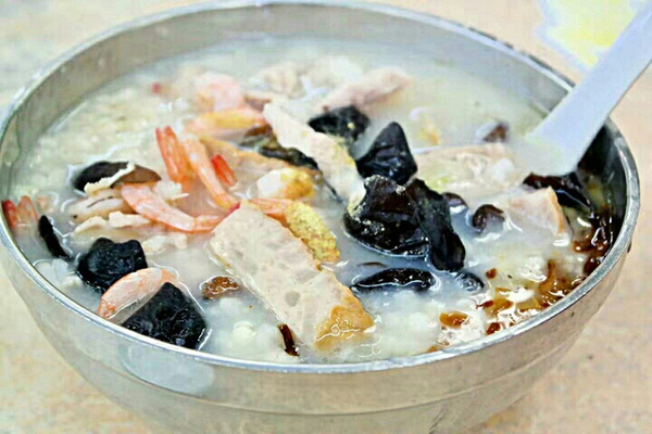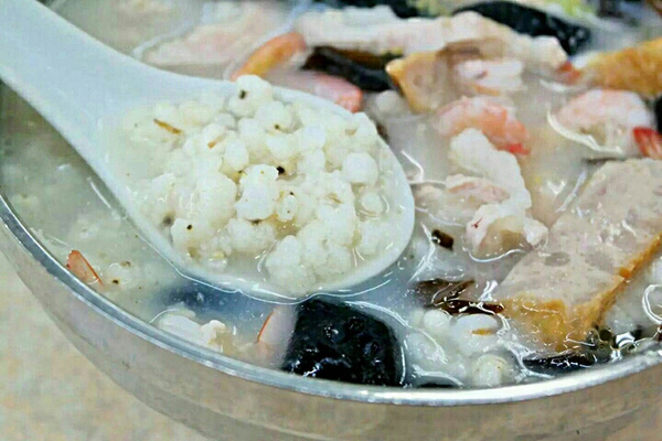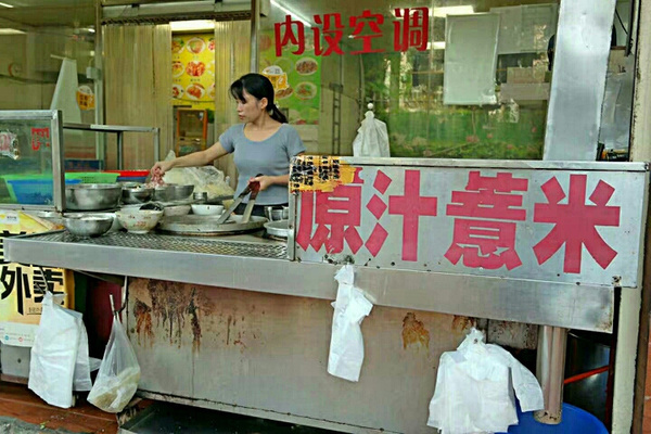 这家店主推的是热气腾腾的薏米汤,其实也就是薏米做的粥。这款薏米粥的特色在于原有黑木耳的基础上,还可以任选三样配菜,比如肉饼、虾、肉筋等。大大的一碗才10元哟! 广场正宗原汁薏米