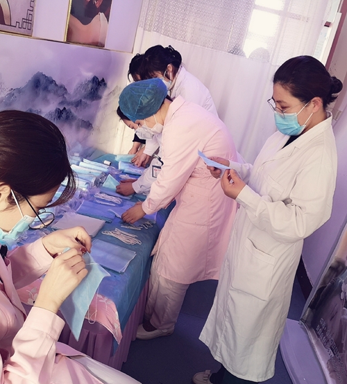 “你戴的口罩是布的,疫情期间这样的根本起不到防护的作用啊!”“哎!现在口罩是紧俏货根本买不到,没办法只能用这个凑合了!”。 近日,乐陵市妇幼保健院产后康复科主任王慧在为产妇治疗时,发现好多产妇戴的口罩都是普通的布料口罩。 目前疫情形势仍然严峻,口罩成为广大人民群众的生活必备品,好多药店、商店不是限购就是脱销。了解这个情况后,王慧心急如焚,她决定自己出钱购买一些口罩分发给广大产妇。可是几经联系,很多口罩生产企业货源紧缺,供不应求。“主任,抖音上有自制口罩的教程,我们是不是也可以自己做口罩分发给那些需要的产妇呀?”正在王慧为找不到货源发愁时,一名护士把自制口罩视频分享给她。在认真看完“教程”后,王慧决定带领全科人员尝试一下。