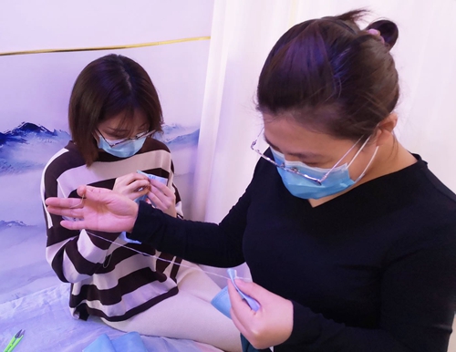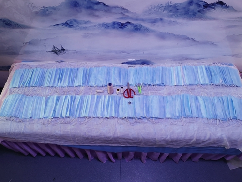 说干就干。做口罩首先就要找到合格的原材料,于是她经多方查找对比,分别在三家网店自费采购了100米医用口罩原材料。大家在家里带来了针线、剪子、顶针等工具。于是照着视频分工合作有负责剪裁的、有负责折叠的,有负责缝口罩片的,有负责挂耳的,有负责固定鼻夹的......一边看视频,一边摸索着小心翼翼的缝制,每个口罩要用三层,经过穿针、铺布、缝制……一上午的时间终于有几个像模像样的自制口罩新鲜出炉了,经过测试完全能达到医用口罩的标准。