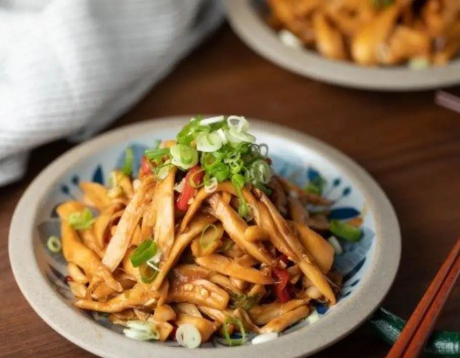 利用手撕的方式让杏鲍菇的口感更加有咬劲,加上菇类特有滑顺的质地,让这道菜每次咀嚼都让人有惊奇的感觉,搭配香辣的调味让它不管是当作小菜或是完整的料理都很适合喔。 【食材】:杏鲍菇450g、蒜末1大匙、辣豆瓣酱(可省)1小匙、米酒0.5大匙、酱油0.5大匙、蚝油1大匙、辣椒1根、葱花适量 【做法】:1首先将杏鲍菇顺着纹路撕成长条状。(不要撕太小条) 2接着热油锅,将蒜末、豆瓣酱下锅爆香后.倒入杏鲍菇炒出水份、香气。 3等锅中水份炒干后,加入调味料炒匀。 4最后加入辣椒、葱花拌匀就完成了。 小贴士: 1.杏鲍菇不要洗、也不要撕太小段,不然香气炒不出来且炒完太细口感不好。 2.不吃辣的朋友可以将辣豆瓣省去。 3.调味料因品牌、个人口味不同,请依照实际情况调整。 第五款虾肉鸡胸马蹄煎饼