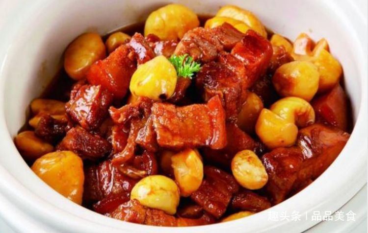 板栗红烧肉 材料:板栗、五花肉、八角、香葱、花椒、生姜、香叶、辣椒、冰糖、食用油、食盐和生抽。 美食做法: 1、先把所有需要使用到的材料都进行一下处理,将板栗的壳给去掉了之后,将板栗肉给取出来,将板栗肉仔细的用水冲洗好,接着把清水给放进锅里,把锅中的清水给加热到开了之后,将板栗肉放进锅里,同时加入一些食盐,煮上三到五分钟后就可以把板栗给取出来,五花肉用水冲洗掉了血水之后放在案板上切成块,同样放进锅里经过焯水这样的一道工序,但是要在锅里放入料酒和香葱段来一起煮,这样可以让五花肉的腥味消除掉。 2、把食用油给放进锅中,把锅中的食用油给加热到开了后,放入生姜片和葱段进入锅里煸炒,煸炒到香味散发出来了之后放入五花肉块进去煸炒,煸炒上三到五分钟后放入冰糖。 3、将板栗也放进锅中一起煸炒,接着放入料酒、老抽、生抽、花椒、八角、香叶和清水,用大火加热到开了之后,把火候给转换成小火后炖煮上三十到四十分钟,等到五花肉被完全炖的软烂了就可以加入一些食盐,接着把火候换成大火,让五花肉吸收料汁的味道,等到料汁被吸收的差不多了之后就可以倒入碟子中食用了。