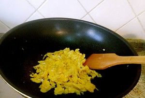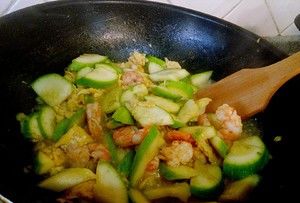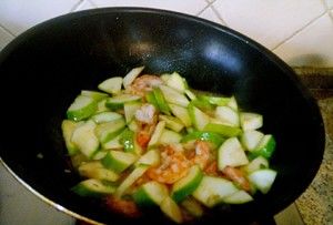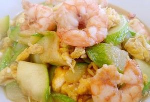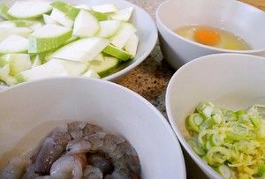 西葫芦1个,鸡蛋3个,手剥大虾8个,葱、姜、生抽、花生油、胡椒粉、盐、鸡精 西葫芦虾仁炒鸡蛋的做法: 油热,倒入鸡蛋翻炒,盛出待用。