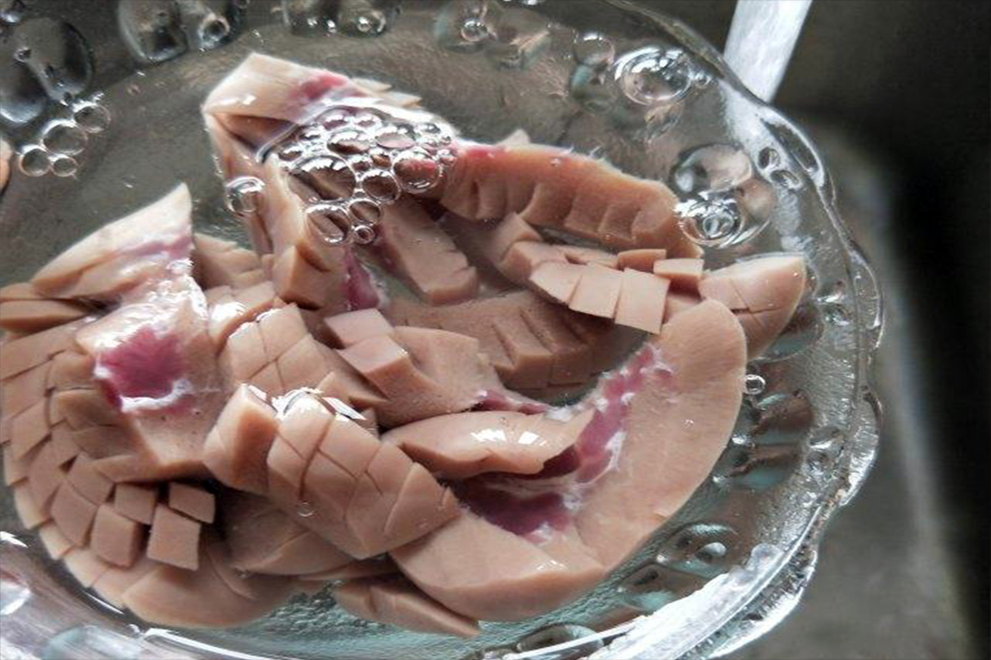 4、再放入盆中冲洗掉血水,再放到花椒水盆里浸泡15分钟,15分钟后捞出来沥水备用。 2、再准备一些新鲜的平菇,先用清水洗干净,然后将蘑菇根去掉,最后再将平菇撕成大小合适的块;