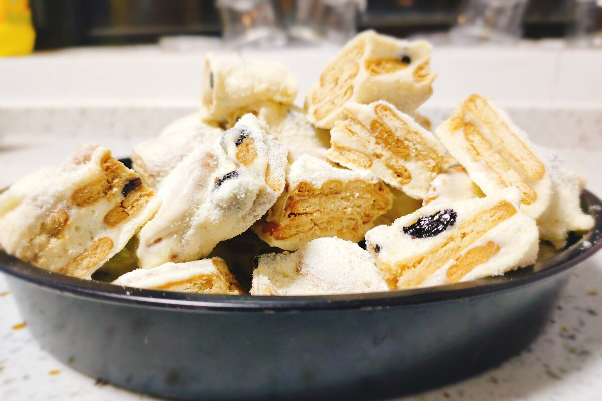 | 3、带上一次性硅胶食品手套,将保温的果干、饼干和蔓越莓倒入锅内,可以用折叠和拉扯的方式混合锅内食材,直至把棉花糖和所有材料混合均匀为止,将混合均匀的食材放入雪花酥放入烤盘内,将其放在烤盘上,按照你想要的厚度摊平,用擀面杖将表面压平,趁热在表面均匀地撒上奶粉,翻面,继续均匀地撒上奶粉; 再捞出来就非常入味儿了,我们的水煮花生就做好了,做法简单又好吃;
