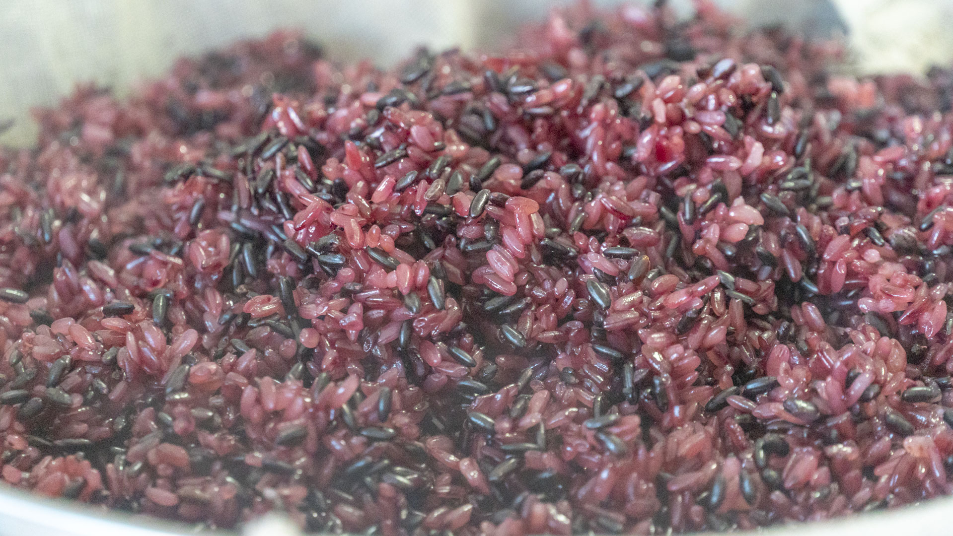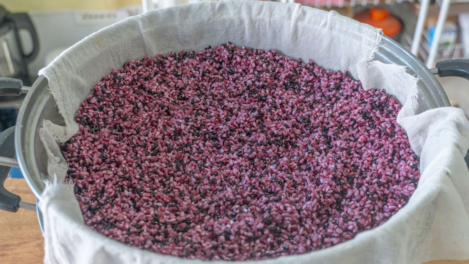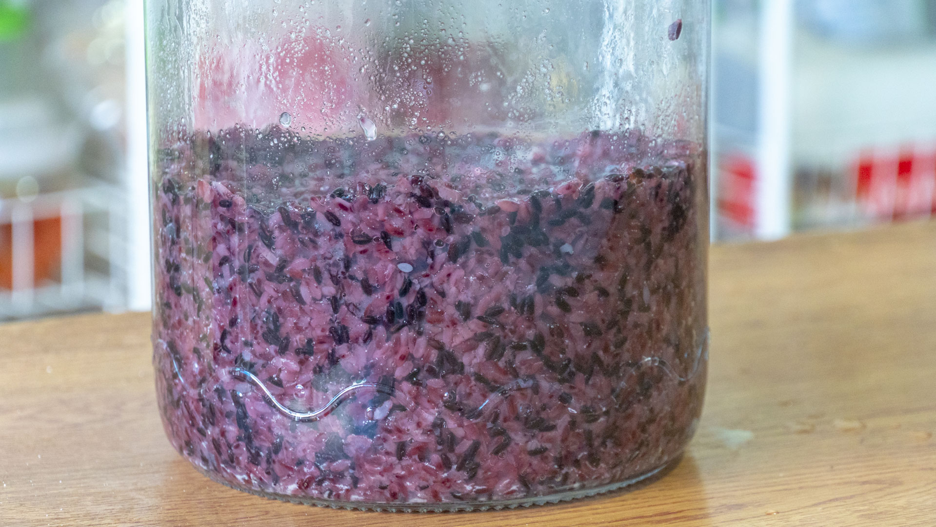 2、第二天糯米也被染色了,后期做出来的酒酿颜色也会更漂亮,泡好的米先把水倒掉,然后再加清水冲洗一遍,接着倒出来沥干水分。