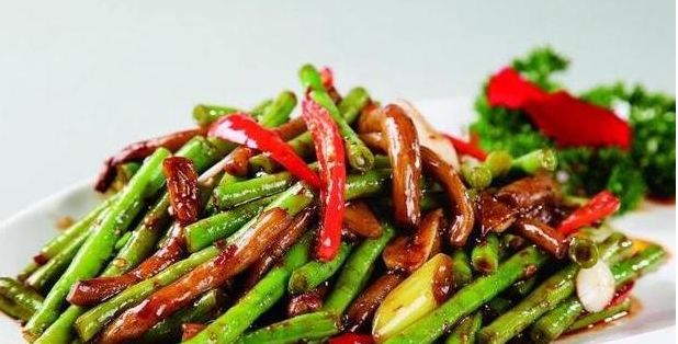 6.用半碗水、酱油、美极鲜味汁、耗油、糖调成碗汁,浇入锅中,收汁,水分半干后即可出锅。 食材:180克 豆角、100克 茶树菇、15克 红椒、大蒜少许、各适量 盐、生抽、嘉豪鸡粉、水淀粉 6、 倒入红椒丝,炒匀,盛入盘中即成。