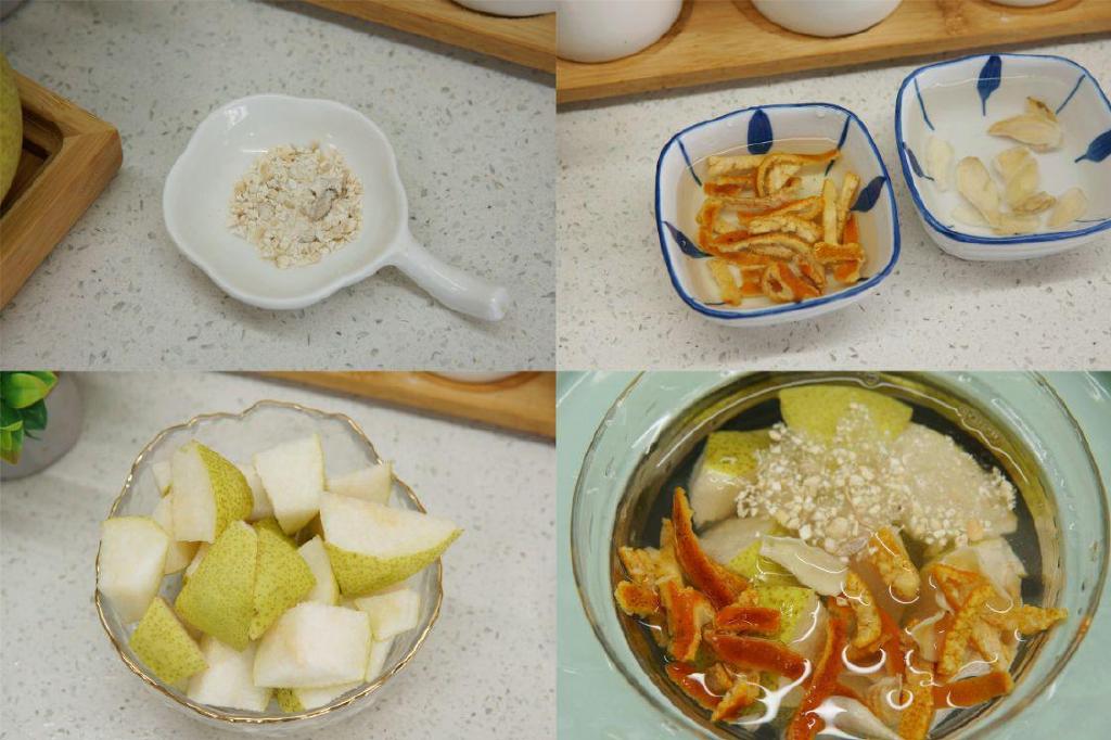 3、将梨块、百合和陈皮放入炖盅中,盖上盖子炖煮半个小时左右,加入冰糖即可。 推荐菜谱:蒜香酱炒蛋