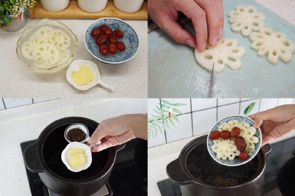 进入大雪节气,北风呼啸、天气寒冷,人们食欲大开正是“冬补”的好时候,此时大家更偏爱高热量、高脂肪的食材,常吃羊肉、炸物、火锅等来补充营养和热量,抵抗这寒冷的冬季。但长时间吃厚重油腻的食物,对肠胃可能有一定的负担,还要注意荤素搭配、应季而食。 1、莲藕清洗干净刮掉莲藕皮,放入清水中以免与空气接触莲藕氧化变黑,红枣洗干净放入水中浸泡,准备几片姜片和红糖。